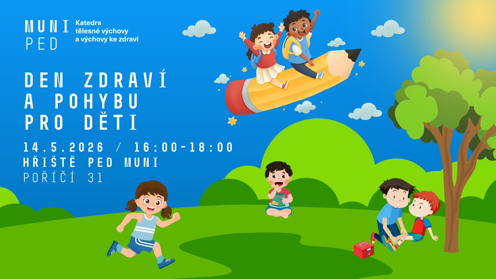Katedra tělesné výchovy a výchovy ke zdraví Pedagogické fakulty MU připravila pro děti do 11 let odpoledne plné pohybu, her a praktických aktivit. Akce se uskuteční ve čtvrtek 14. května 2026 od 16:00 do 18:00 ve venkovním areálu na Poříčí 31.